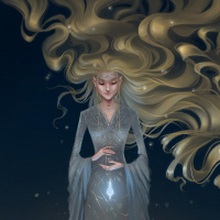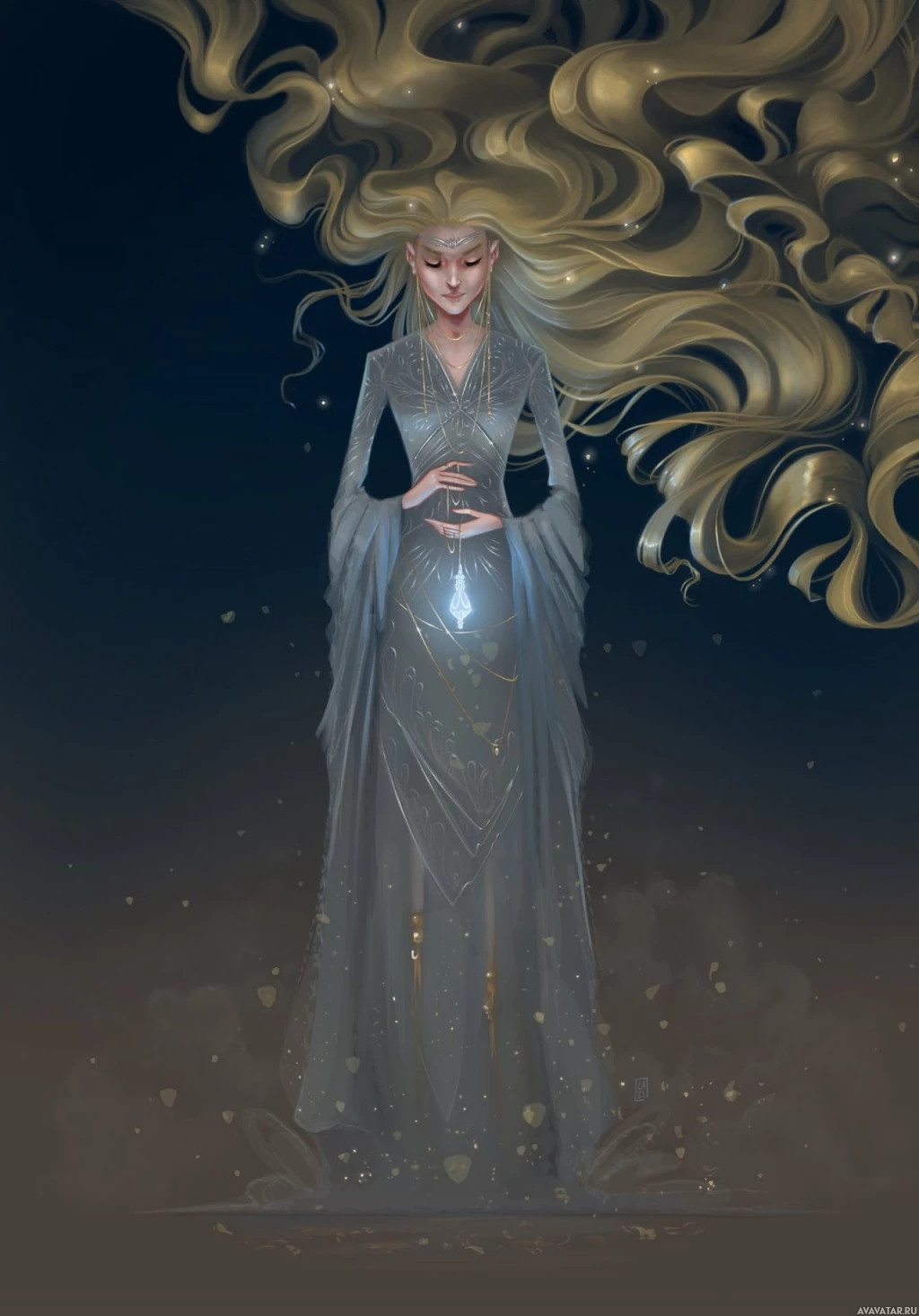 blonde hair that flows behind her as if it were a part of her ethereal presence. She wears