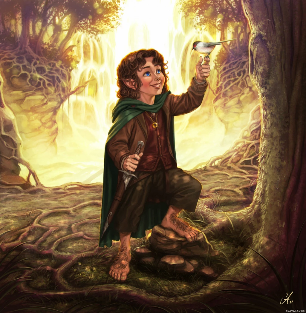 particular scene, Frodo appears to be looking upwards and smiling at something out of frame, suggesting he might be interacting with the bird or observing something in the distance. The setting looks like the Shire from Middle-earth, characterized by its lush greenery, waterfall, and trees, which are typical elements found in Tolkien's imaginary world.