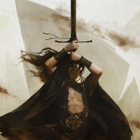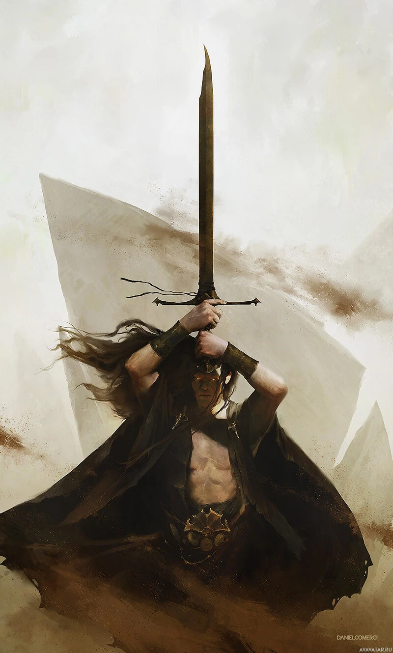 На картинке изображен персонаж, вооруженный мечом и одетый в доспехи или плащ. Персонаж, похоже, находится в движении, возможно, во время боя или батальной сцены. Фон размыт, но можно предположить, что он находится на открытом воздухе в естественной среде. Художественный стиль - реалистичный, с вниманием к деталям в костюме и вооружении.