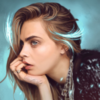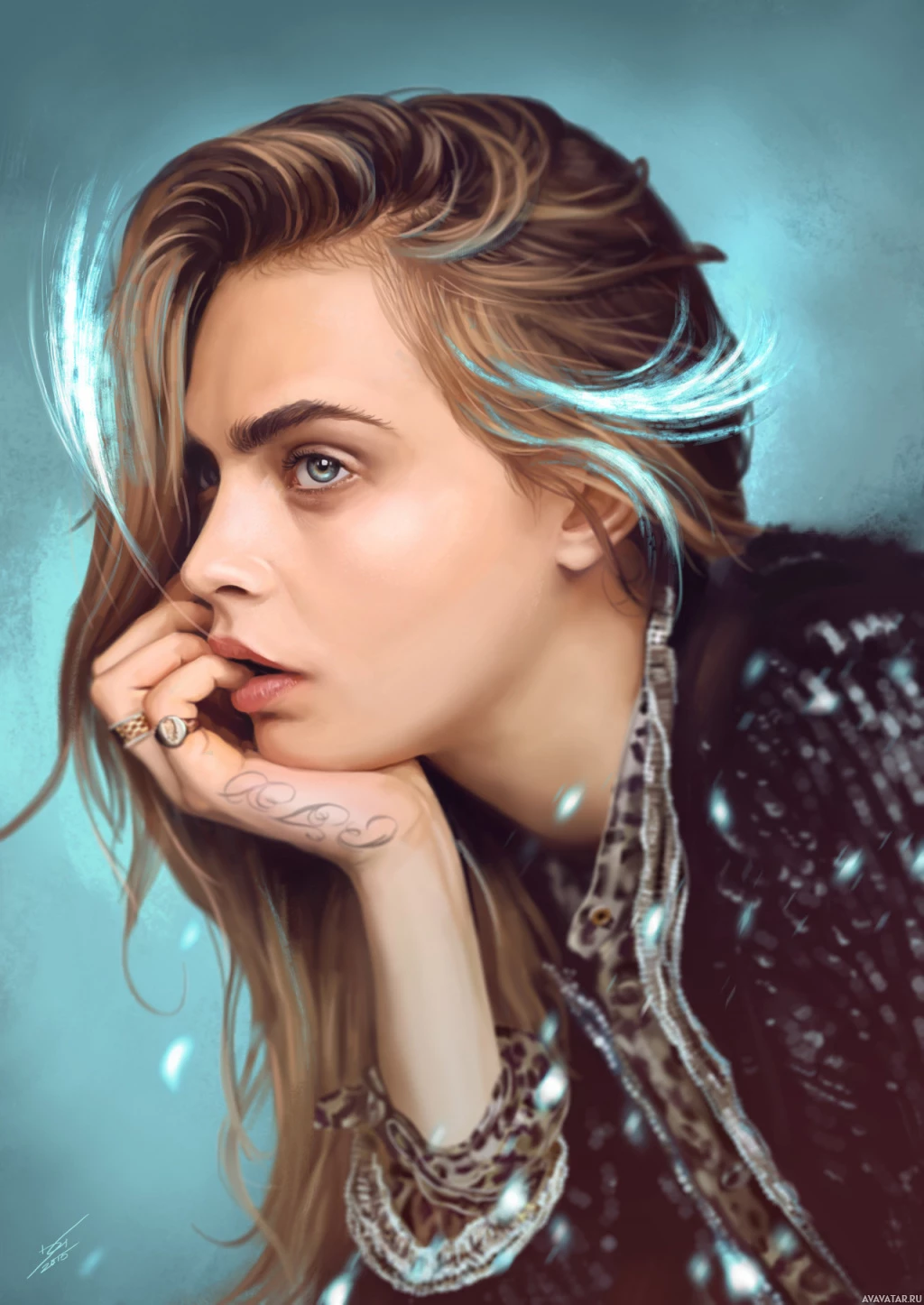 a young woman with an artistic and somewhat surreal quality. She has long, wavy hair, wears makeup that highlights her eyes, and has