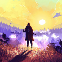 an individual standing on what appears to be a grassy path or field. The person is facing away from the viewer and towards a large, ominous shadow that looms in the background, suggesting