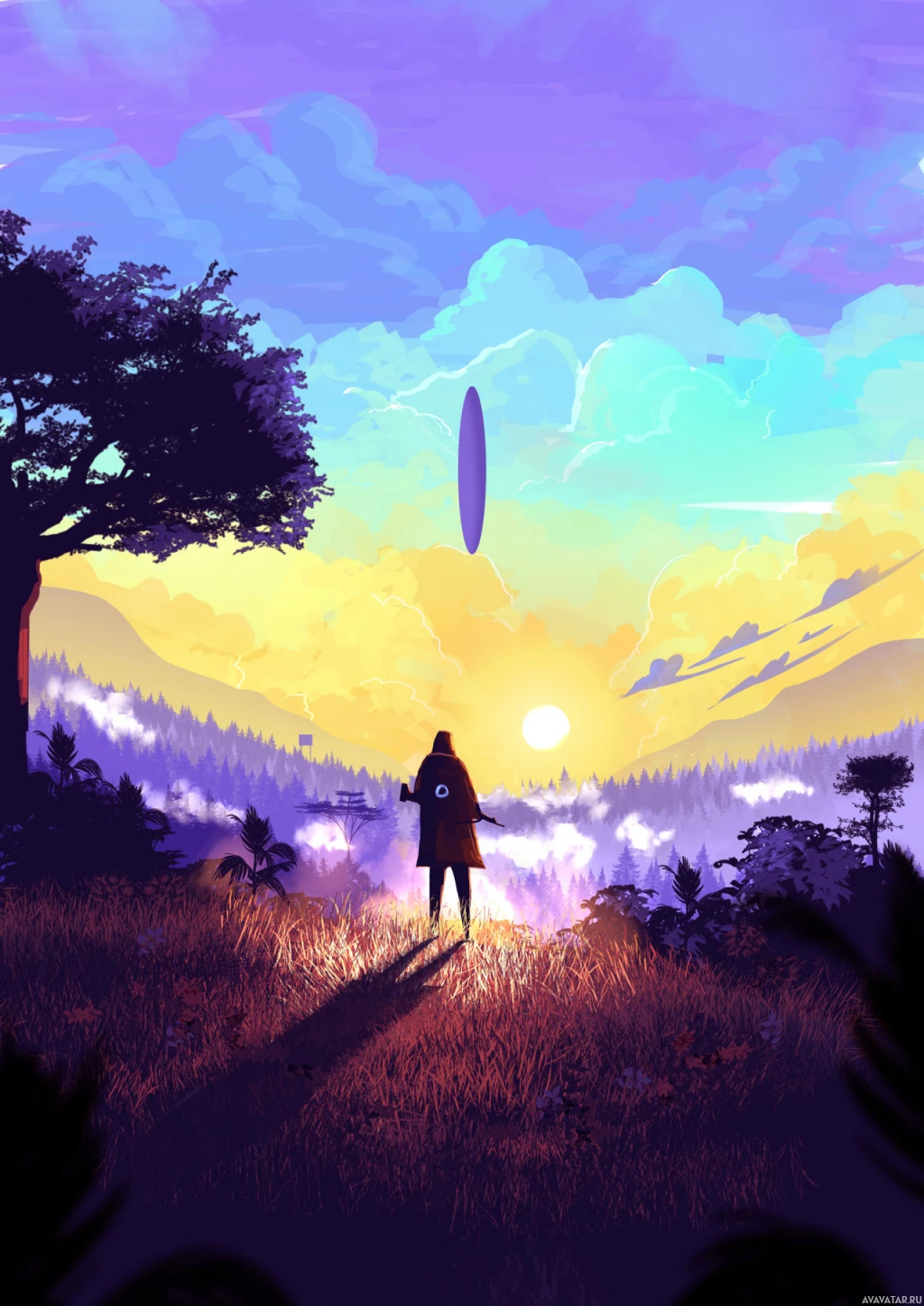 mountainous area. The sky is adorned with warm sunset colors, including shades of orange and pink near the horizon, transitioning into cooler tones as they extend upward towards the top of the image. The overall mood of the picture conveys a sense of solitude and mystery, inviting viewers to wonder about the story behind the silhouette's journey.