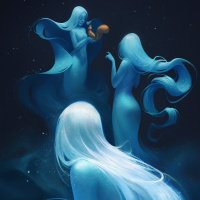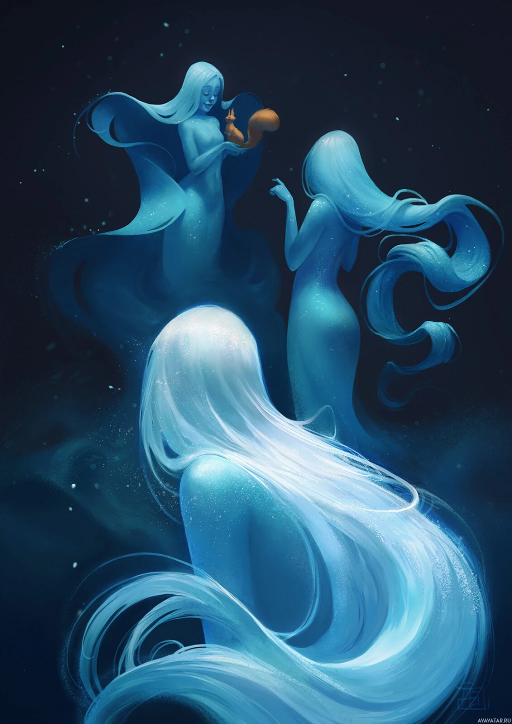 The image depicts three fantastical figures that resemble mermaids or other