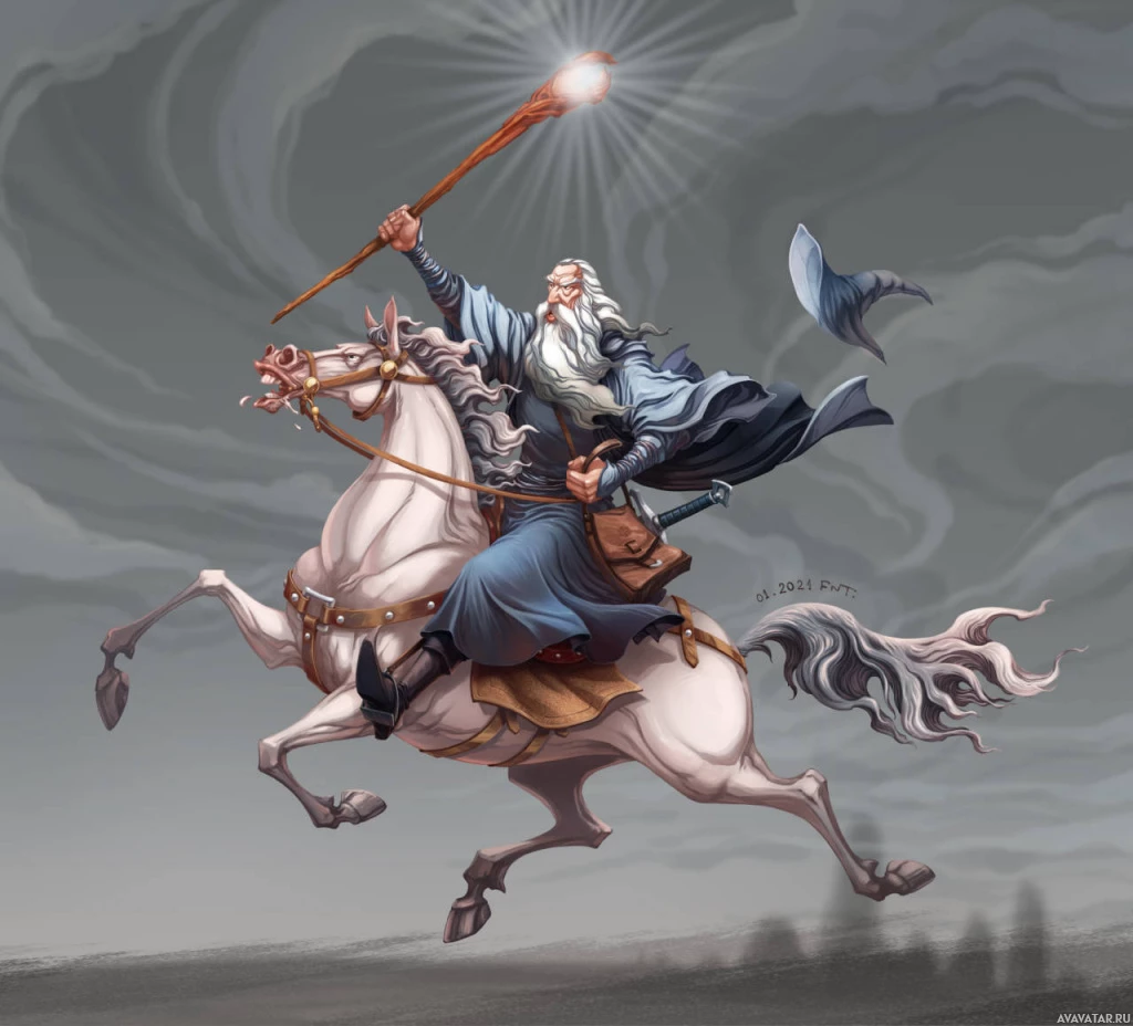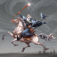 the dramatic effect of the scene. The character riding the horse is reminiscent of Gandalf from J.R.R. Tolkien's "The Lord of the Rings" series.