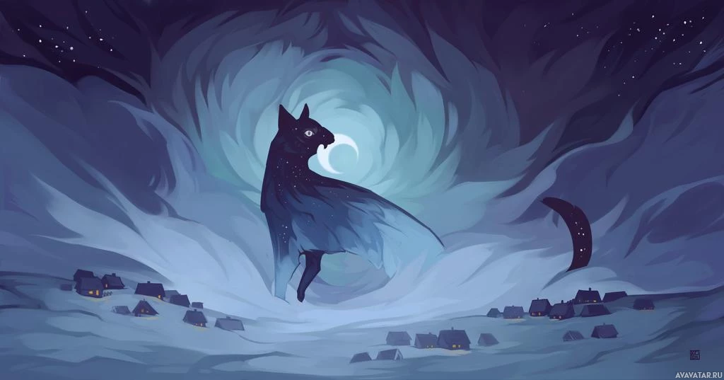 a serene landscape featuring silhouettes of buildings that suggest it might be a town or village. The overall mood of the image is peaceful and dreamlike, evoking a sense of wonder and fantasy. The artist has used a color palette with cool tones to create this magical atmosphere.