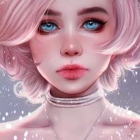 blue eyes and is wearing what appears to be a necklace or a choker-style accessory around her neck. Her expression is neutral, and the overall color scheme of the image is soft and pastel. There are