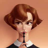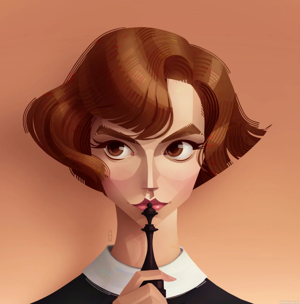 На рисунке изображена девушка с рыжими волосами. Она одета в черно-белый наряд, что наводит на мысль о том, что она могла бы быть частью сериала или персонажем истории, связанной с шахматами. Рисунок выполнен в стиле чистых линий, характерном для современных иллюстраций.