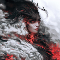 wavy hair and is adorned with what looks like feathers or flame motifs on her attire. The color palette of the image is dominated by dark tones, with red accents that add