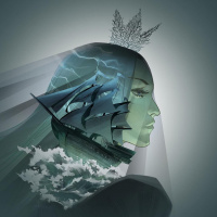 The image features a stylized illustration of a girl's head. Her hair appears to be flowing behind her, suggesting movement or speed. On her face and neck, there are elements that resemble a ship and waves, which could symbolize a connection to the sea or sailing. There is also a crown-like feature on top of her head, possibly representing