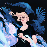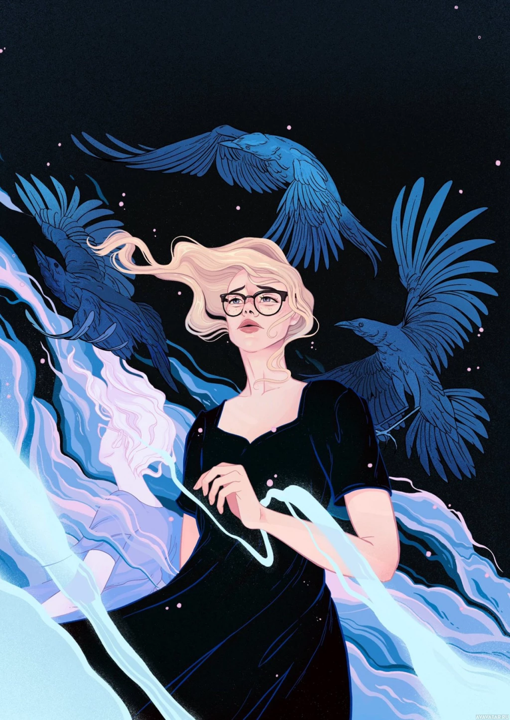blonde hair, wearing glasses and a black dress. She is surrounded by multiple crows, which appear to be in flight. The background features a dark, almost