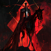 dark background with red and black accents that give an impression of a fiery or hellish environment. The rider appears to be armored and may be a knight or warrior given the style and context. The artwork has a dramatic and intense feel, suggesting it could be related to themes such as adventure, battle, or demonic forces in
