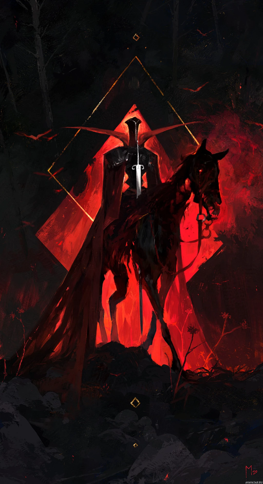 The image depicts a fantasy-themed artwork featuring a rider. The central figure is astride a horse, and both are set against a stark,
