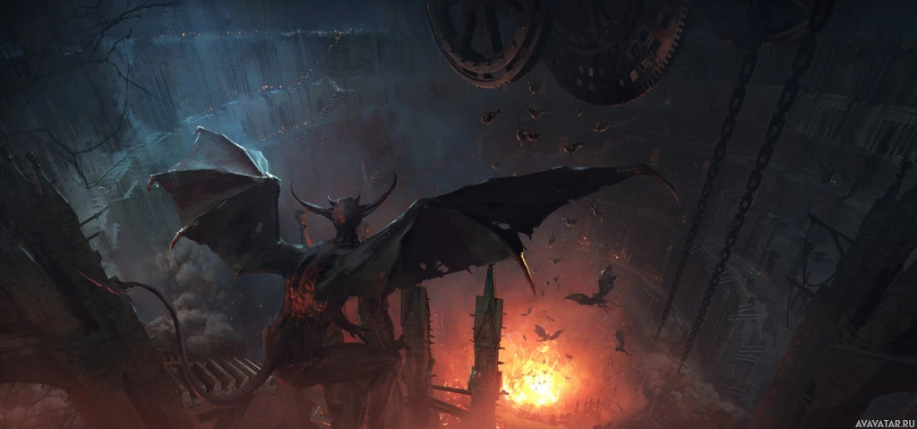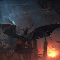 fantastical creature with wings, possibly a dragon or a similar mythical beast, in a dramatic pose as if it is engaging in combat. The character is surrounded by chaos; there are explosions and debris flying through the air, suggesting an intense