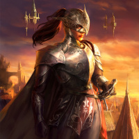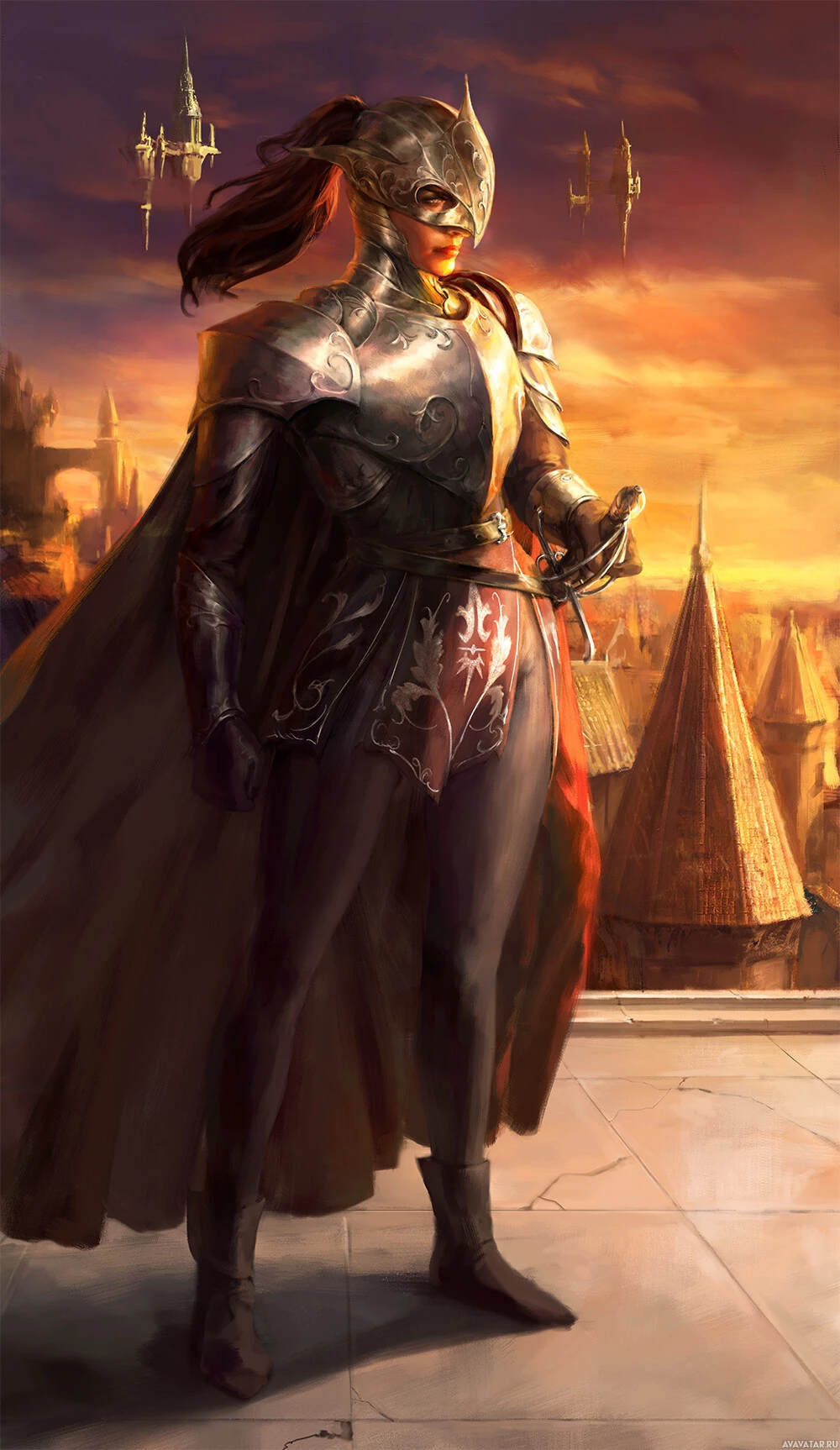 elaborate armor that includes chainmail and plate elements, and her helmet has a distinctive horned design on the crest. In her right hand, she holds a sword upright with a poised posture, suggesting readiness for battle or