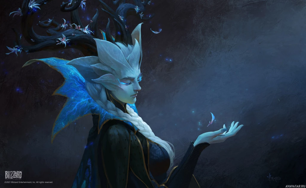The image features a fantasy-themed character with a serene and mystical appearance. She has closed eyes, which may suggest she is in a state of meditation or enjoying