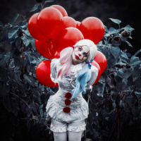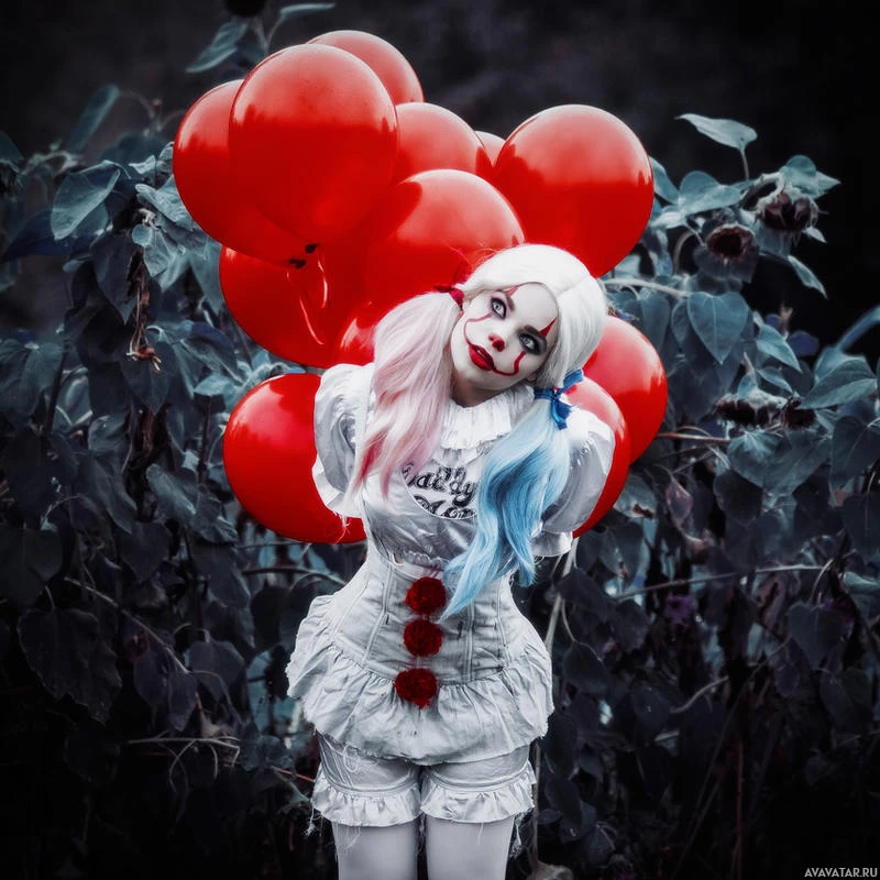 a clown costume, with balloons behind them. This is a cosplay photo that mimics the appearance of Pennywise from the movie "It," which features a character known for his creepy and menacing presence. The individual is wearing the traditional white face paint,
