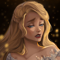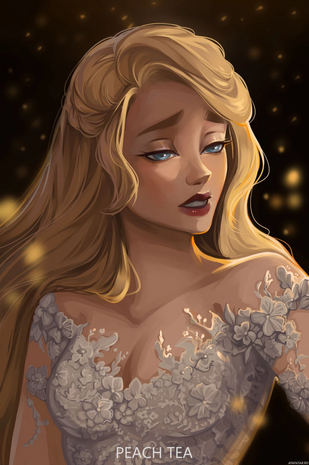 a female character with blonde hair, wearing what appears to be a wedding dress or formal gown. She has a thoughtful or contemplative expression on her face. In the background, there are swirling patterns that could suggest a whimsical or magical theme, and there's text at the bottom right corner that reads "PEACH TEA," which is likely the artist's signature or branding.
