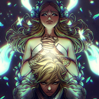 blonde hair and pointed ears, wearing a crown and sitting in a poised position. She has wings sprouting from her back. The other character is a male with brown hair and what appears to be a sword strapped to his hip. He is looking upwards at the woman, who seems to be casting a spell or performing some sort of magical action, as indicated by