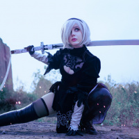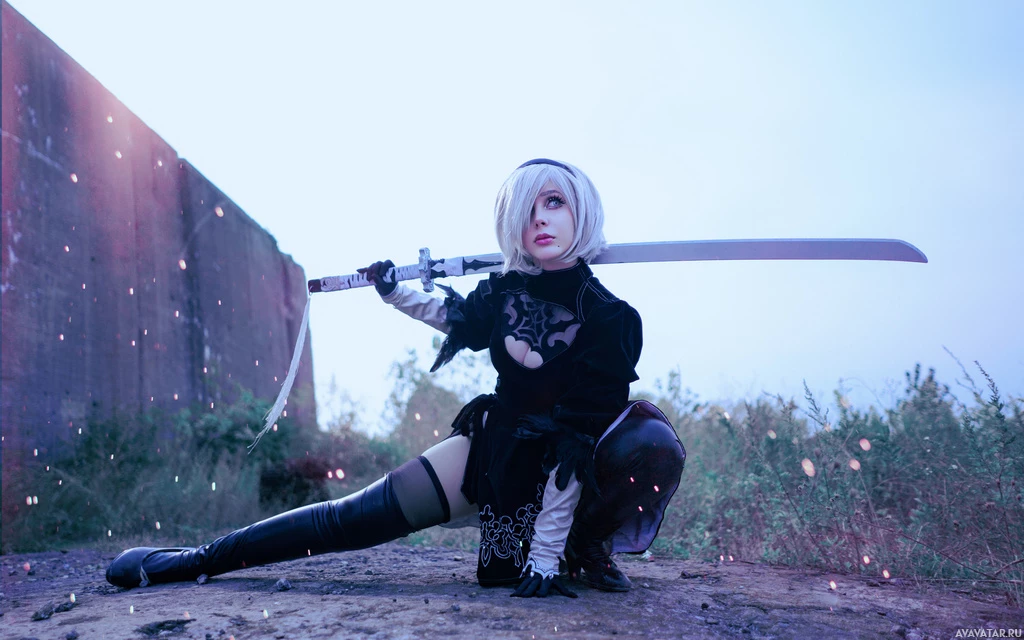 The image depicts a person dressed as YoRHa: 2B, a character from