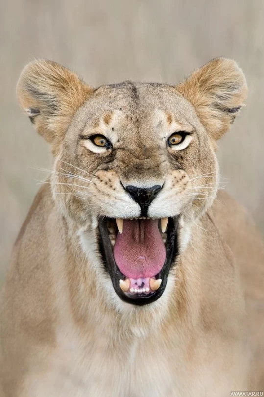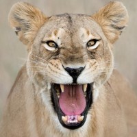 На картинке изображен лев, проявляющий агрессивное или оборонительное поведение, с открытым ртом и видимыми зубами. По-видимому, это рев или рычание, что часто связано с проявлением доминирования или запугивания у этих животных.
