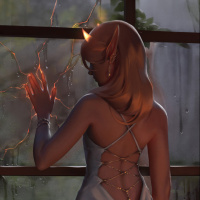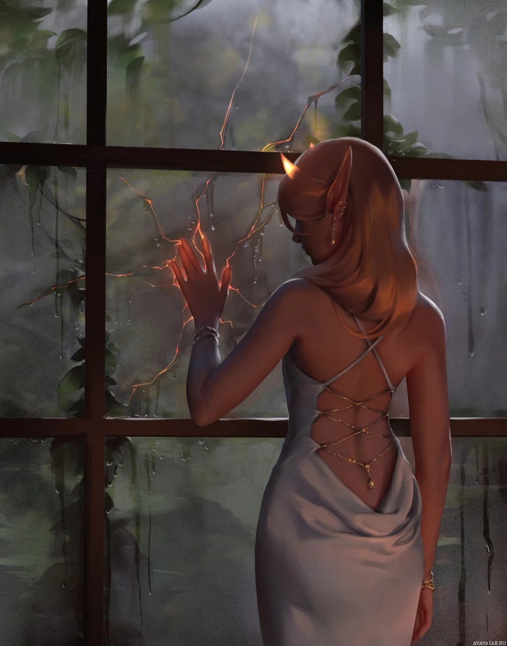 blonde hair and is looking out of an open window with an elf-like appearance to her face, such as pointed ears. Behind her, the setting appears to be in a forest or a jungle at night, illuminated by