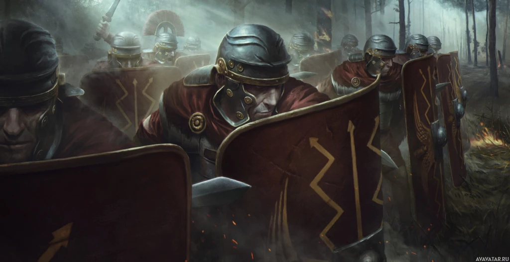 a group of men in what appears to be ancient Roman armor. They are equipped with shields, helmets, and swords, suggesting that they are warriors or soldiers prepared for battle. The background features