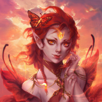 red hair, pointed ears that resemble an elf's, and is adorned in what appears to be magical or otherworldly attire. Her facial features are exaggerated, giving her a distinctly artistic appearance. The background suggests a sunset or sunrise with warm colors, which adds to