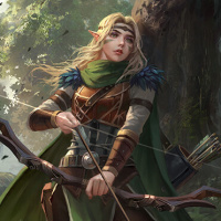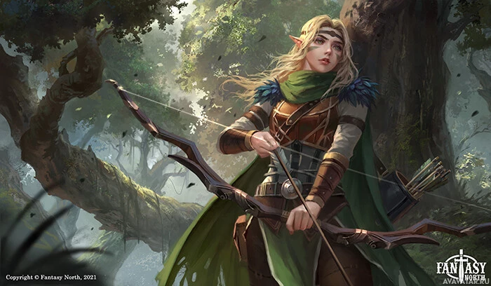 The image depicts a female character from a fantasy setting, resembling an elf. She is holding a bow and appears to be in a forest or wilderness environment. Her attire suggests she could be a warrior or archer, typical of elves in fantasy literature and games.