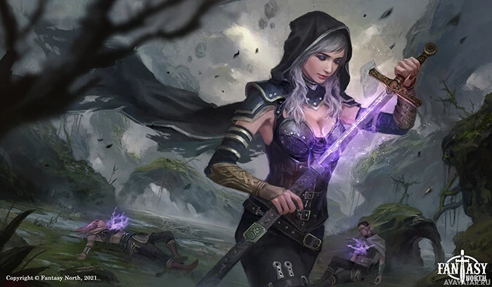 the purple energy emanating from her fingers. The background of the image shows a dark and ominous environment that appears to be a battlefield with fallen