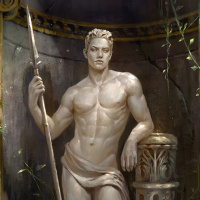 a muscular build and is holding what seems to be a lance or spear, which suggests that he might represent a warrior or an athlete from a historical or mythological context. The setting includes classical architecture elements like columns and a pedestal, indicating