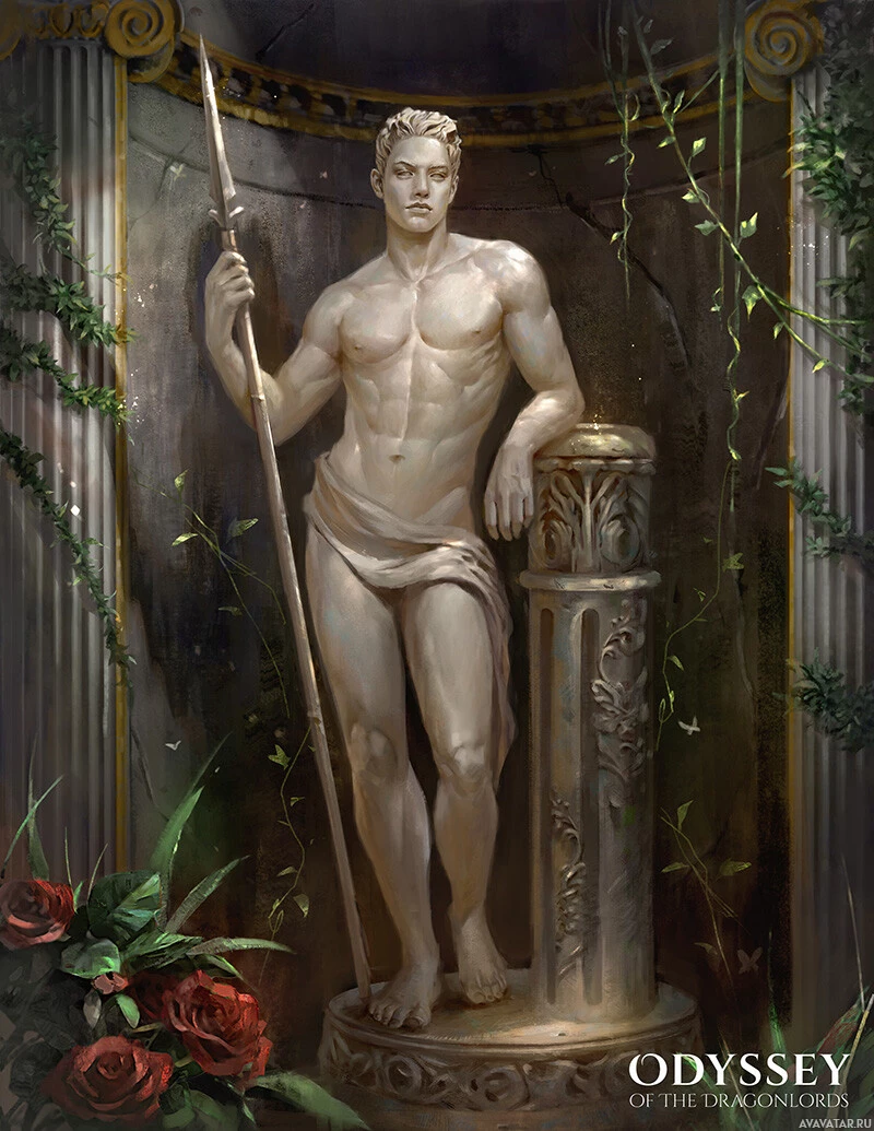 a male figure who appears to be a statue or sculpture. He is depicted with