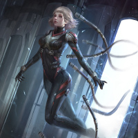 blonde hair and is wearing an advanced armor or suit with intricate details that suggest advanced technology or possibly a superhero costume. There are mechanical or cybernetic elements on her arms, which could indicate that she is equipped for combat or has