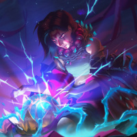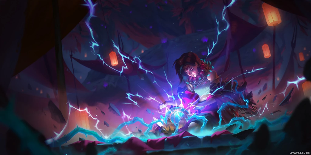 the seated character. The setting is fantastical and appears to be outdoors at dusk, with a misty or magical atmosphere. In the background, there's a silhouette of what looks like a dragon or a creature that emits electricity or energy, contributing to