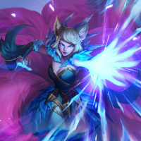 League of Legends" named Ahri. She is depicted with a fantasy-themed design, wearing a costume that includes elements such as a pink and purple