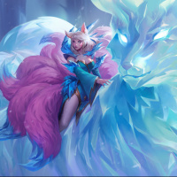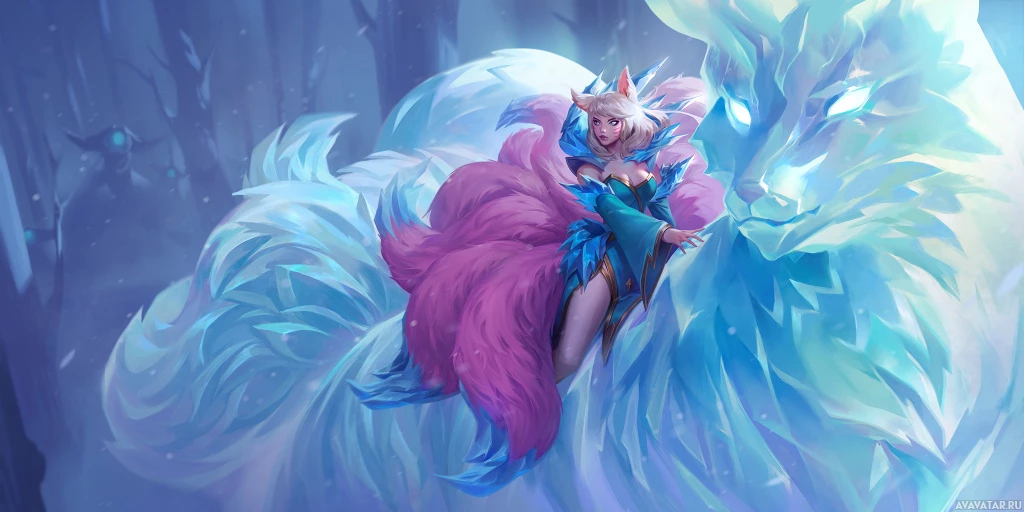 the video game "League of Legends," specifically Ahri. She is known for her fox-like appearance, often accompanied by a fox summon named Seraphine. In this particular illustration, she is shown with a magical,