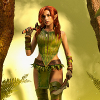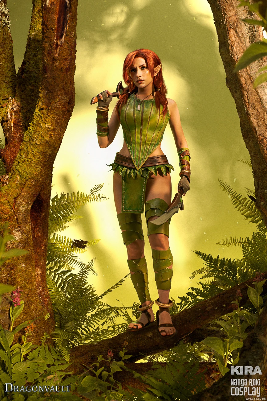red hair and stands confidently in a forest-like environment with misty lighting that creates an atmosphere of fantasy and mystery.