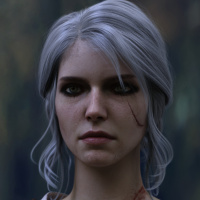 grey hair and a scar on her cheek. She appears to be in a contemplative or serious mood. The background suggests a dark, forest-like environment that is consistent with the game's setting.