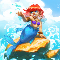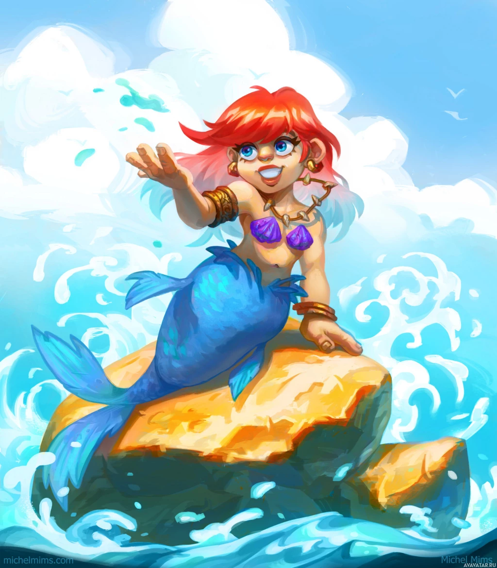 an aquatic setting, with waves and clouds that give the impression of being above water. This character is likely designed for fantasy or animated purposes.
