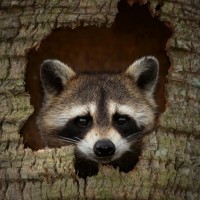 The image shows a raccoon peeking out from an opening in a tree trunk. It appears to be a curious or playful moment captured, where the raccoon seems intrigued by what is outside of its den. This is a classic example of how animals adapt their environments for shelter and curiosity.
