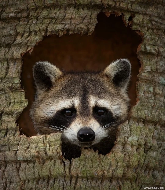 Картинка показывает енота, выглядывающего из отверстия в стволе дерева. Кажется, что это любопытный или игривый момент, когда енот заинтригован тем, что находится за пределами его логова. Это классический пример того, как животные адаптируют свою среду обитания для укрытия и любопытства.