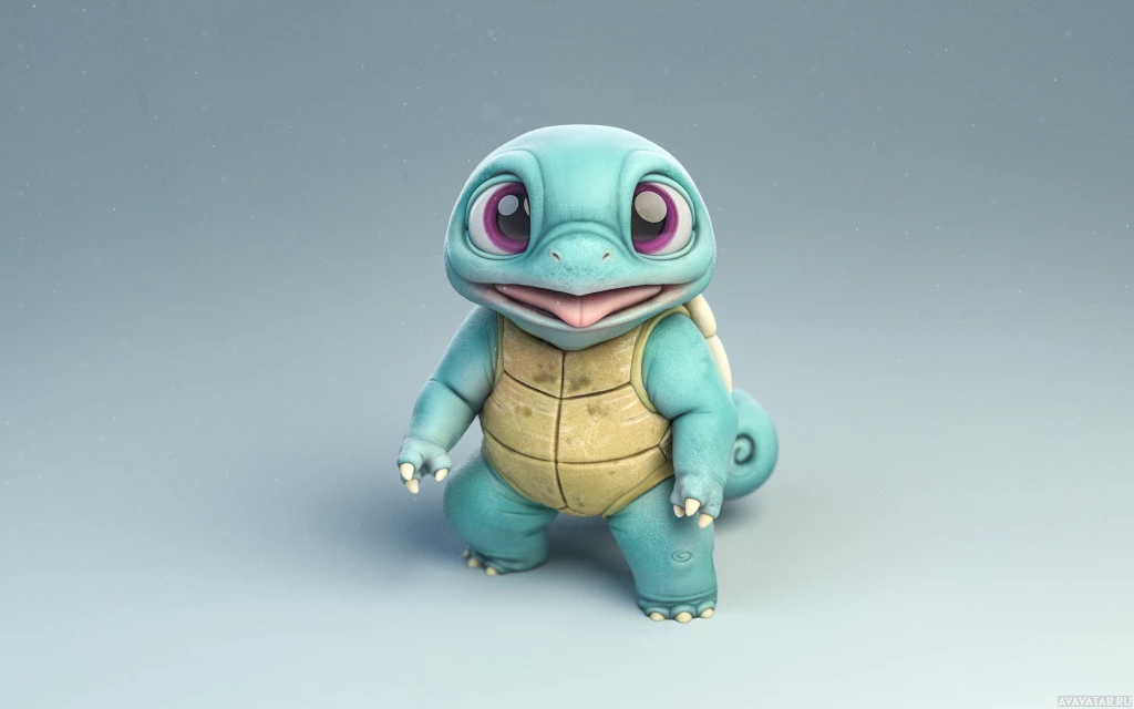 На картинке изображена 3D-модель или фигурка Сквиртла, популярного персонажа-покемона. Сквиртл изображен в своей культовой синей форме с желтым панцирем на спине и веселым выражением лица.