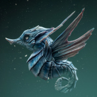 the game franchise. This creature has the body and tail fin characteristics of a salmon or fish-like species, but with the wings and scales of a dragon. It is depicted in mid-flight against