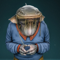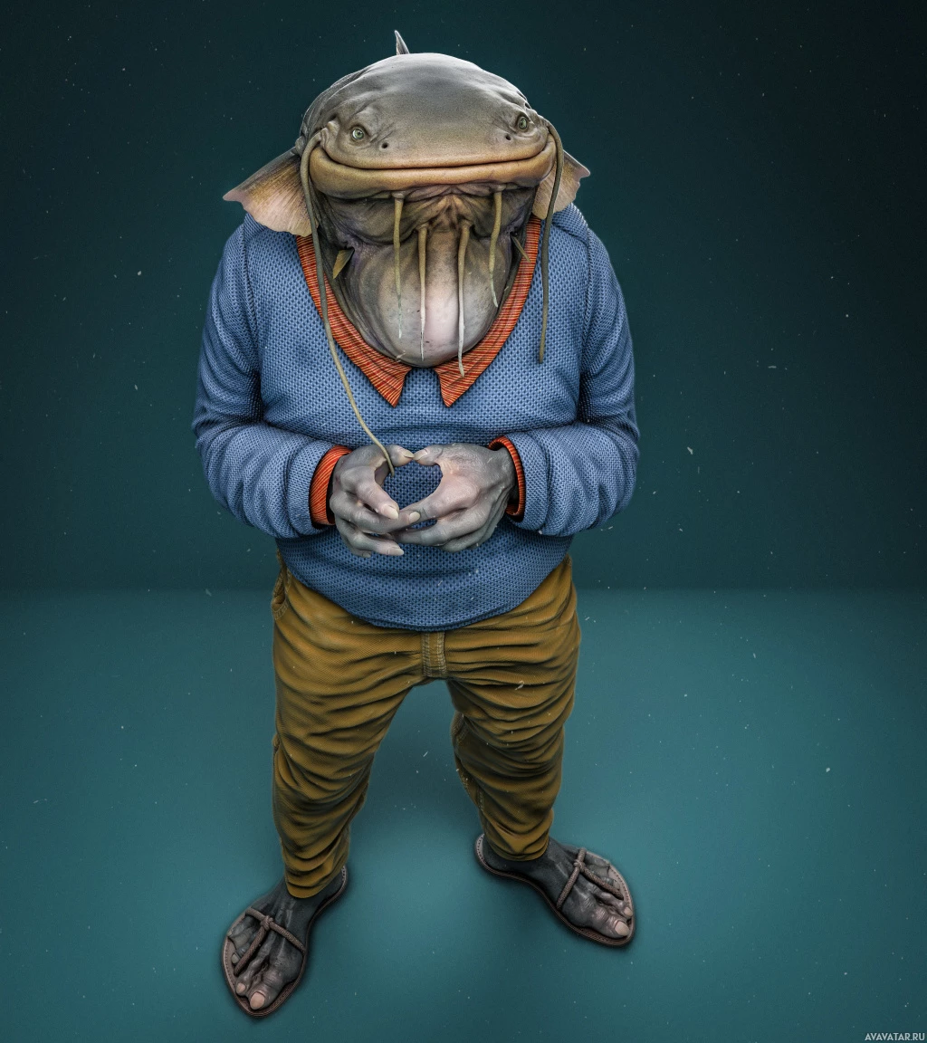 the body structure of a fish, complete with scales, fins, and gills, but with a humanoid head. The character is standing upright like a person, wearing a jacket and pants, which are not typical of
