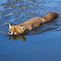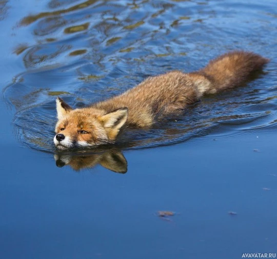 calm water. It appears to be enjoying itself, with the water reaching up to its mid-section, as indicated by the reflection of its head and upper body on the water's surface. The fox has a typical