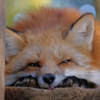 a red fox resting with its head on what appears to be a wooden structure or a piece of wood. The fox has