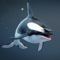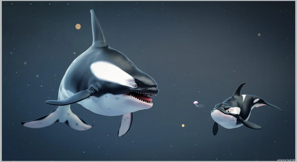 killer whales) in a digital artwork. One of the orcas appears to be an adult, while the other is younger, possibly a juvenile or subadult. They are set against a backdrop that looks like the deep ocean with stars and nebulae, indicating they could be at sea during nighttime under
