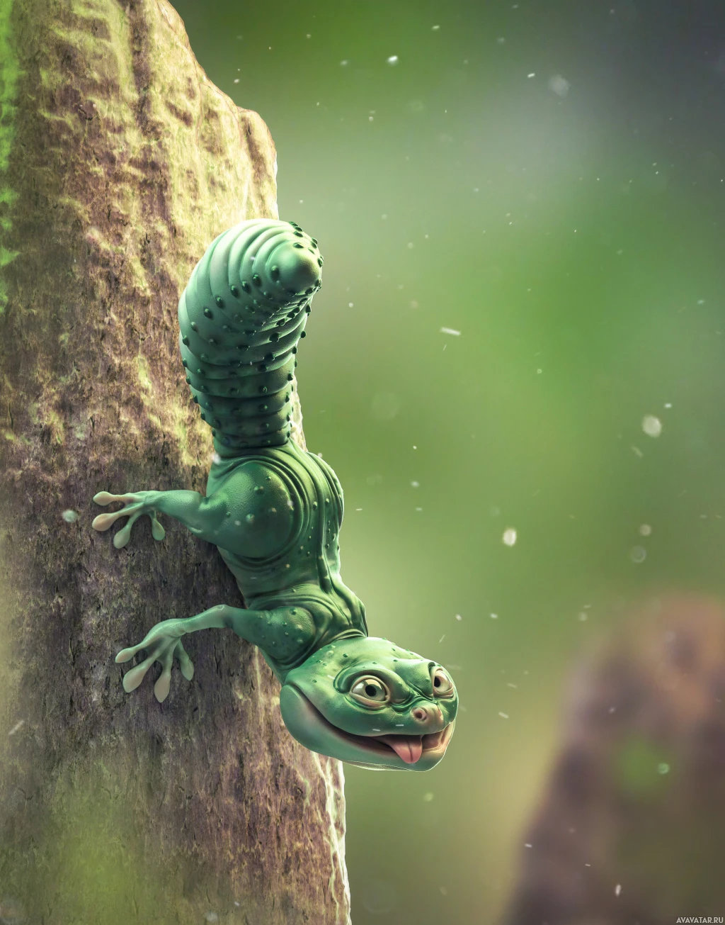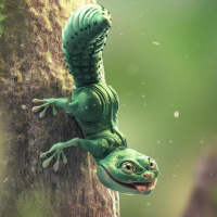 concept art for fantasy stories, games, or movies. The gecko has humanoid features and is depicted climbing up