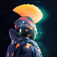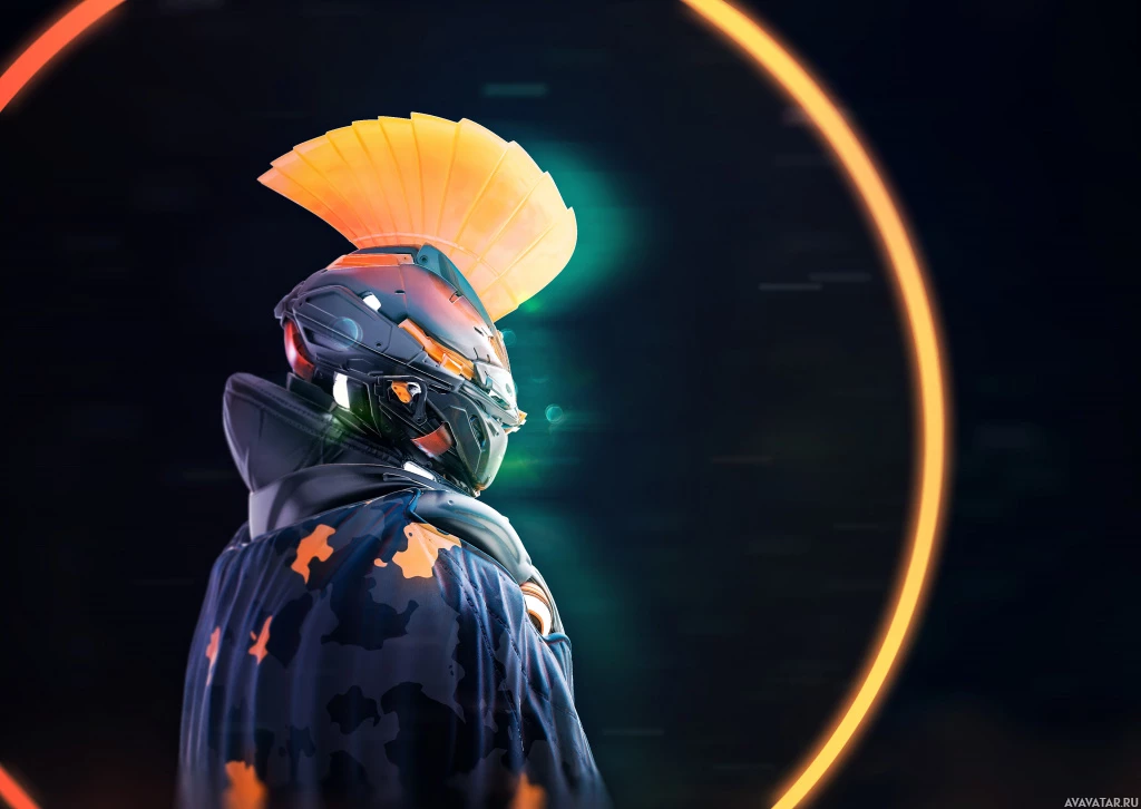The image depicts a figure wearing a helmet with some sort of faceplate or visor that is glowing with an orange-