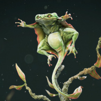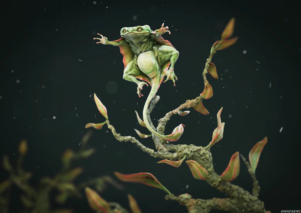 a fantastical scene of a frog standing on what appears to be the branch of a tree or shrub. The background is dark, which may suggest an underwater environment or simply an artistic choice for