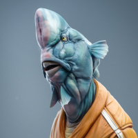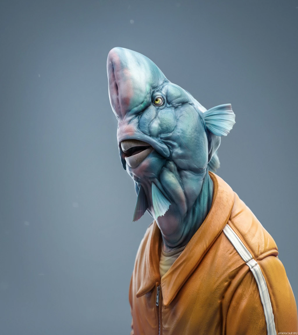 The image features a 3D rendering of a character that appears to be a fish with human-like features. This character has an exaggerated fish head, complete with fins and the typical scales, but it is attached to